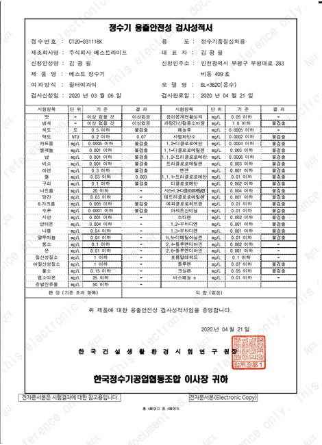 정수기 용출안정성 검사성적서